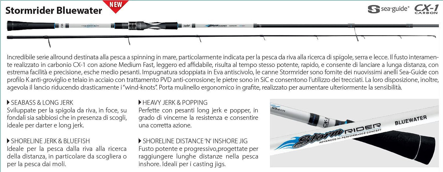 Incredibile serie allround destinata alla pesca a spinning in mare, particolarmente indicata per la pesca da riva alla ricerca di spigole, serra e lecce. Il fusto interamen- te realizzato in carbonio CX-1 con azione Medium Fast, leggero ed affidabile, risulta al tempo stesso potente, rapido, e consente di lanciare a lunga distanza, con estrema facilità e precisione, esche medio pesanti. Impugnatura sdoppiata in Eva antiscivolo, le canne Stormider sono fornite dei nuovissimi anelli Sea-Guide con profilo K anti-groviglio e telaio in acciaio con trattamento PVD anti-corrosione; le pietre sono in SiC e consentono l'utilizzo dei trecciati. La loro disposizione, inoltre,